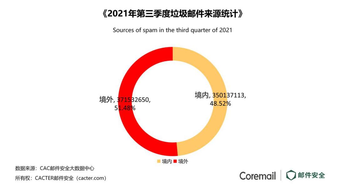根据CAC邮件安全大数据中心统计,2021年Q3季度中,垃圾邮件来源51%,超过3.7亿封垃圾邮件来自境外,境内垃圾邮件来源则占48%,超过3.5亿封。
