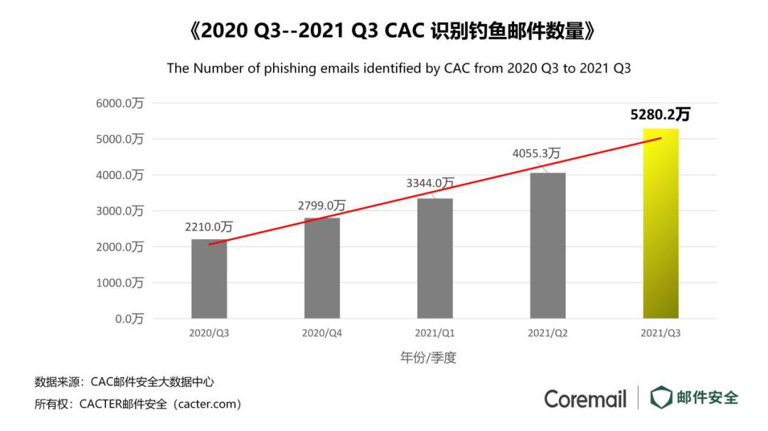 2021年第三季度,钓鱼邮件数量较Q2环比增长了30%。