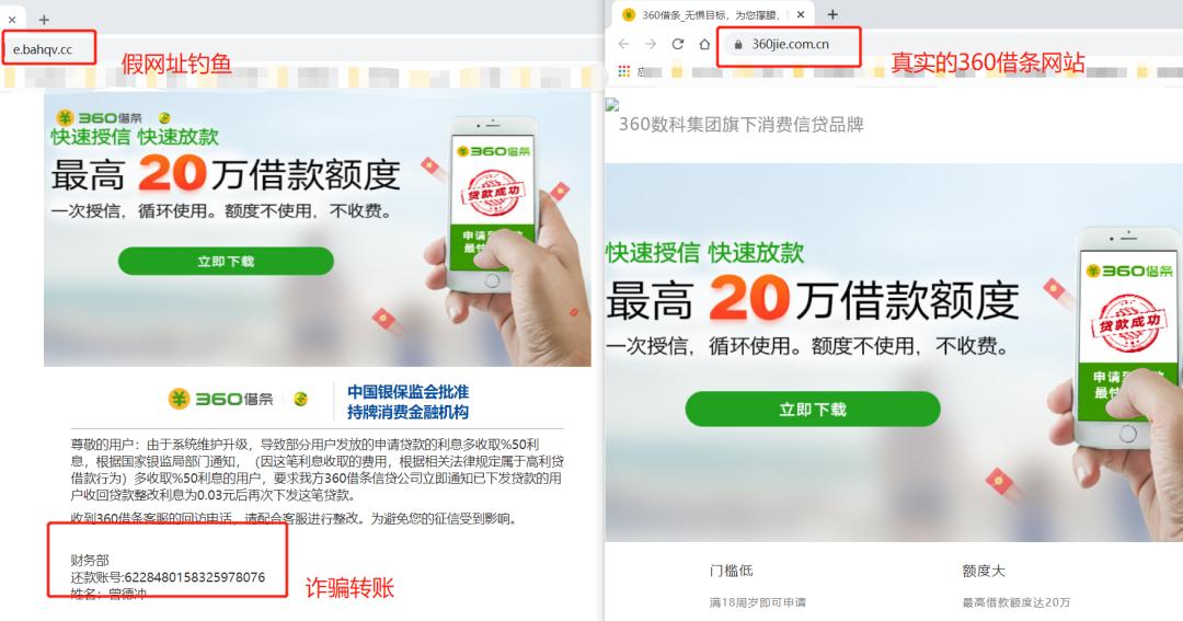 (3)二维码分析:扫描二维码链接跳转到网址http://e.ba***hqv[.]cc,该网址为钓鱼网站,模仿360借条官方网站。主要目的诈骗消费者进行转账。