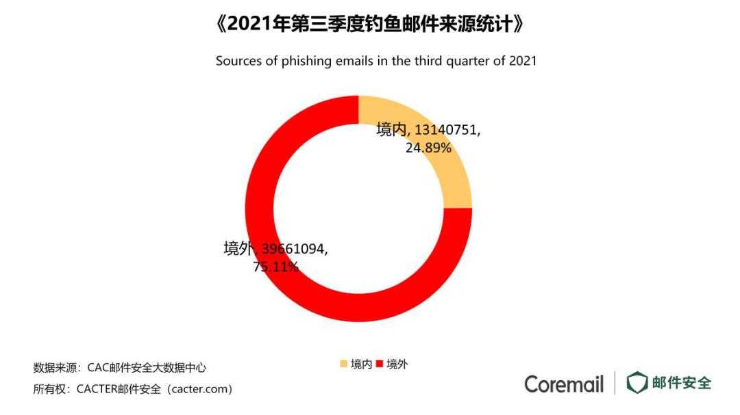 根据CAC邮件安全大数据中心统计,Q3季度钓鱼邮件超过3966.1万封来自境外,占比75.11%,境内仅占比24.89%,约为1314.1万封。