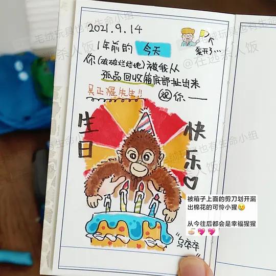 主人给猩猩玩具画的生日卡片,图片:豆瓣用户“在逃杀人饭”