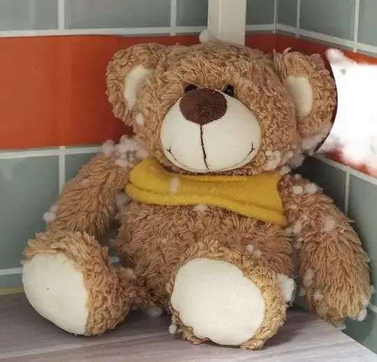 蛙雷支付了小熊从外地寄到自己所在的广东佛山的邮费,收到后又给它泡了羊毛恢复剂,再将发硬的旧棉花混上新棉打散重填,晒干梳毛。修复小熊颇费了一番功夫,但也令它恢复了蓬松柔软。