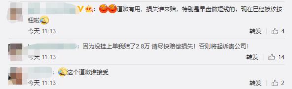 由于同花顺微博已关闭评论,有网友在转发时表示,“因为没挂上单我赔了2.8万,请尽快赔偿损失!否则将起诉贵公司!”
