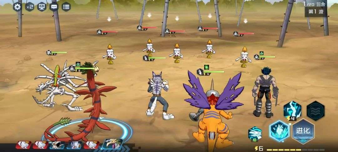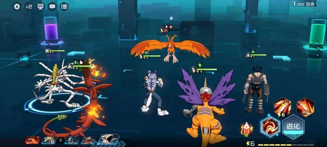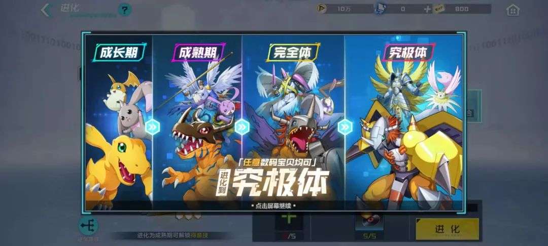 进化是游戏最为核心的养成机制,也是这个IP最大的卖点,相信玩家都熟悉数码宝贝的各种进化阶段,分别分为幼年期1、幼年期2、成长期、成熟期、完全体和究极体六个阶段,越到后期能力数值越强,技能也更为强力。