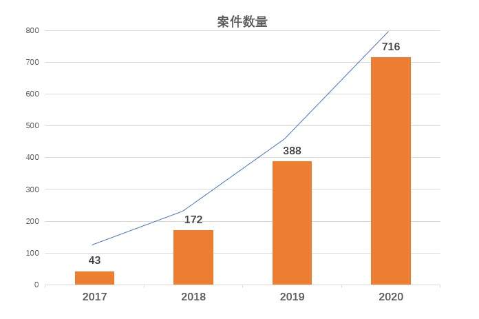 中伦律师事务所数据显示,自 2018 年起,全国网红主播与 MCN 机构之间的争议数量开始连年成倍增长。案件争议数量增长的趋势与中国 2017 年至 2020 年直播电商市场规模的变化趋势基本一致。2017 年,相关争议数量仅为 43 件;2020 年,这个数字增长到了 716 件,三年涨幅高达 1565%。