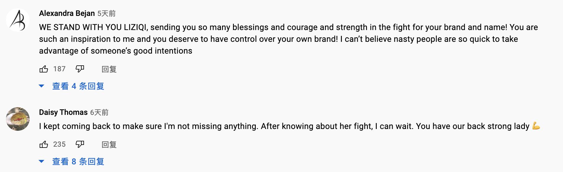 股权争端的细节浮出水面后,舆论形成了一边倒的结果。毫无意外地,在李子柒的微博和相关新闻的评论区,网民们为她抱不平,并控诉微念利用资本的力量“霸凌”内容创作者。在李子柒 1630 万订阅的 YouTube 账号下,有人用英文向海外粉丝解释了她断更的原因,得到了各种语言的回复,不少人表示自己会为这位 strong lady(强大的女士)祈祷。