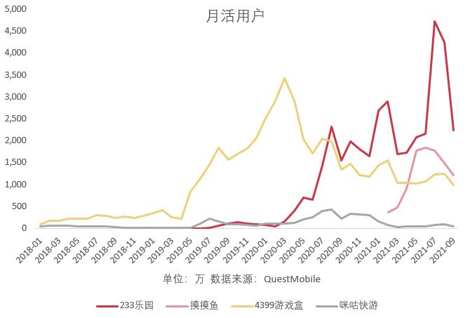 233乐园在今年7、8月的暑假期间,MAU已经飙升到4000万。关于233乐园,之前游戏新知有对游戏盒做过对比和报道,该产品在下沉市场做的比较好。其MAU的一度飙升和未成年占比高有关。据西部证券在7月份的报告,其未成年占到80%。预计今年防沉迷新规出台之后,233乐园会受到一定的影响。