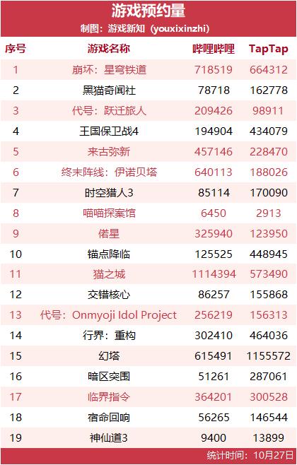 在筛选掉由哔哩哔哩发行的游戏产品后,依然有不少二次元游戏在哔哩哔哩上的预约量要比在TapTap上高,比如最近的《崩坏:星穹铁道》《来古弥新》等。而像《王国保卫战4》《暗区突围》这类二次元浓度不高的产品则不如TapTap的表现。