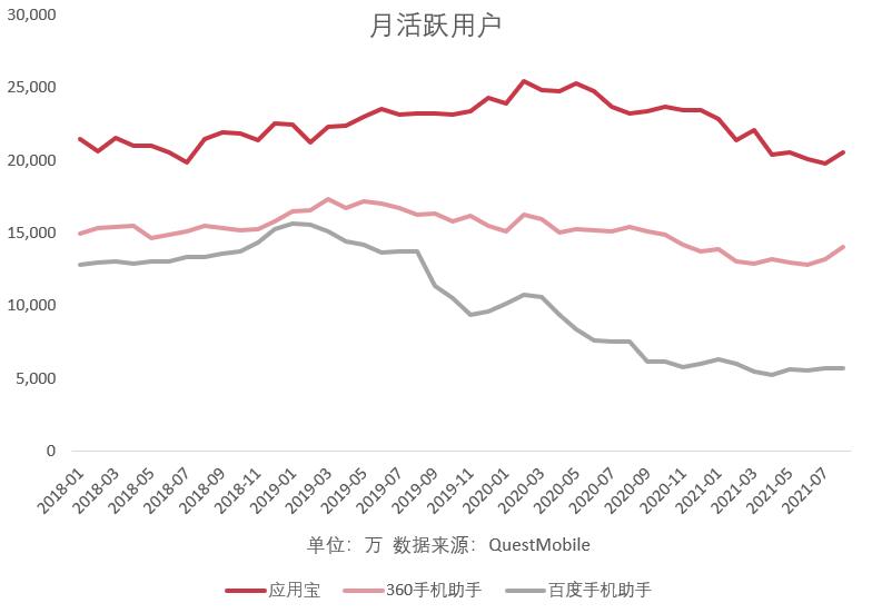 应用宝已经如此,其他第三方渠道更是困难。360手机助手的MAU在一年前跌至1.5亿以下,百度手机助手的MAU从2019年的1.5亿暴跌到如今6000万不到。