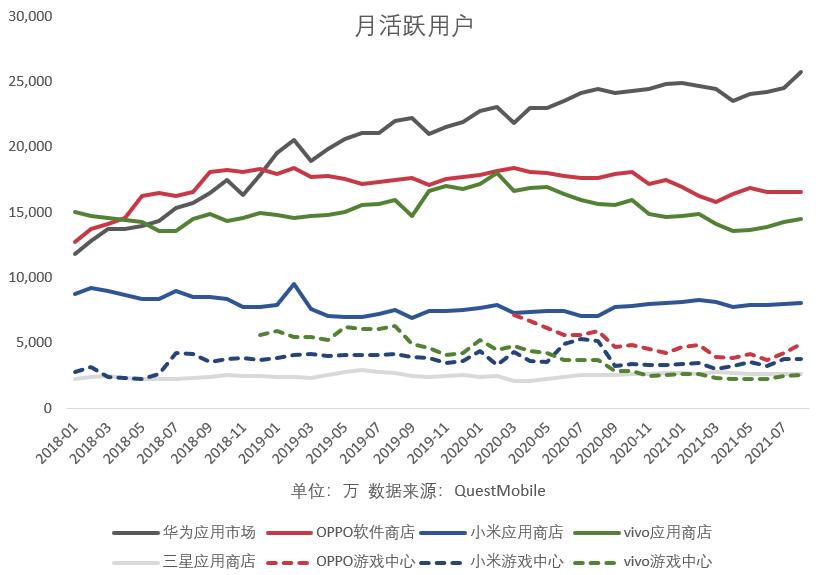根据QuestMobile的数据显示,2021年6月中国智能终端市场,华为的设备以28%的占比居于第一位,比Apple和其他国产品牌都高。这也反映到了手机应用商店的用户数量是一路走高的。