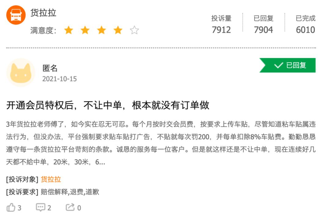 造成负面评价的原因则与货拉拉的业务模式有关。据了解,货拉拉目前主要采取会员制,司机每月需缴纳不同等级的会员费,缴费后可在平台上自由接单。同时,司机入驻平台时需缴纳1000元保证金和300元激活费。另外,平台采用抢单制,仅在部分区域上线了派单模式。