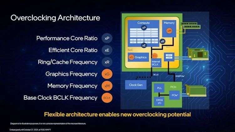 在这个设计基础上,12代酷睿处理器的可超频型号(也就是目前发布的12900K/KF、12700K/KF和12600K/KF)这次几乎是将芯片内部所有与计算性能有关的模块都开放了超频。理论上玩家可以自由调节的选项,包括P核倍频、E核倍频、缓存频率(同时也是内部环形总线频率)、集成的Xe架构核芯显卡频率、内存频率,以及主板时钟发生器的外频。