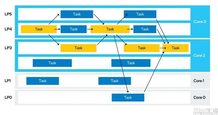 最后一种情况,则是完全针对混合架构进行深度优化的应用了。在这类应用启动时,它们就会自动地创建两个线程池,明确地将重负载任务和轻负载任务放在不同的线程池里执行。而12代酷睿此时也会自动地用大核心执行优先线程池里的任务,用小核心执行次要线程池的任务。