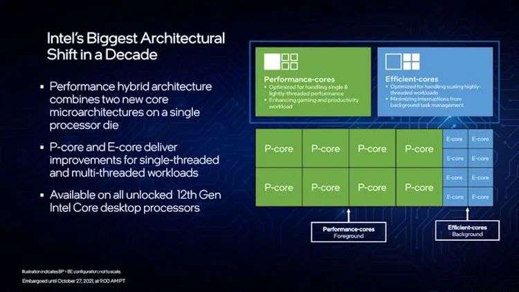 平心而论,虽然“大小核”的CPU设计在智能手机、平板等移动设备上已经很常见,但在PC领域、特别是x86架构处理器上,“大小核”设计的第一次大规模应用,还是要从此次的12代酷睿算起。