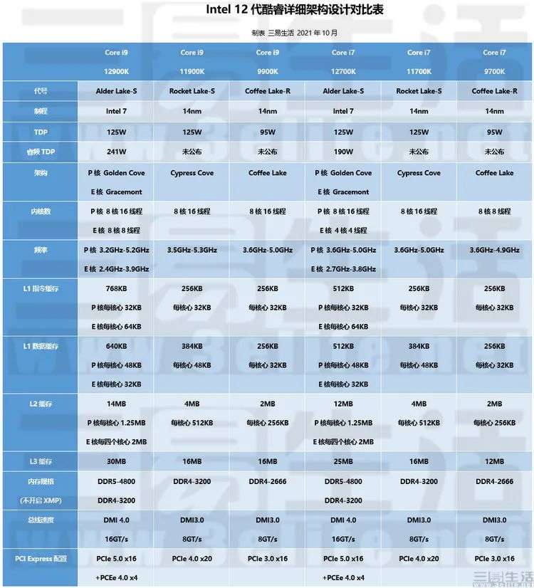 与此前的“架构日”相比,虽然今天Intel关于12代酷睿的底层技术信息公布得并不算多,但因为具体的6款新品信息正式解禁,也使得我们三易生活终于有机会将12代酷睿与Intel此前的CPU架构得以进行一次更为直观的比较。