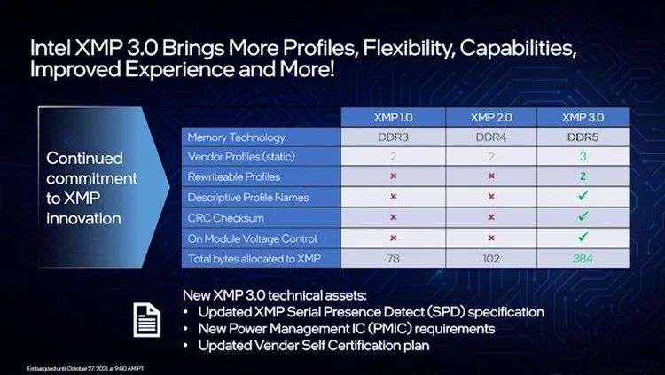 在这当中,尤其是12代酷睿的内存超频功能可以说是相当特别。一方面,Intel通过XMP 3.0规范为DDR5内存引入了更多的内置频率选项,现在一条顶级的DDR5超频内存出厂时可以预设多达三种不同的XMP超频频率,便于玩家根据自己的需求以及主板体质进行选择。同时,XMP 3.0还允许内存厂商额外再预留两个内存超频频率的“空白档”,玩家可以将自己调节出来认为最适合的频率、小参、电压等信息直接写入内存,并且不再需要第三方工具,自然同时也大幅降低了操作的风险。