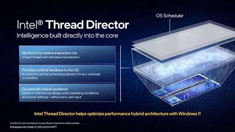 根据此前Intel架构日公布的资料显示,在12代酷睿处理器内部集成了一个名为Intel ITD(线程调度器)的硬件单元,它的作用就是配合操作系统里的软件调度器,实现应用程序的自动任务分配。