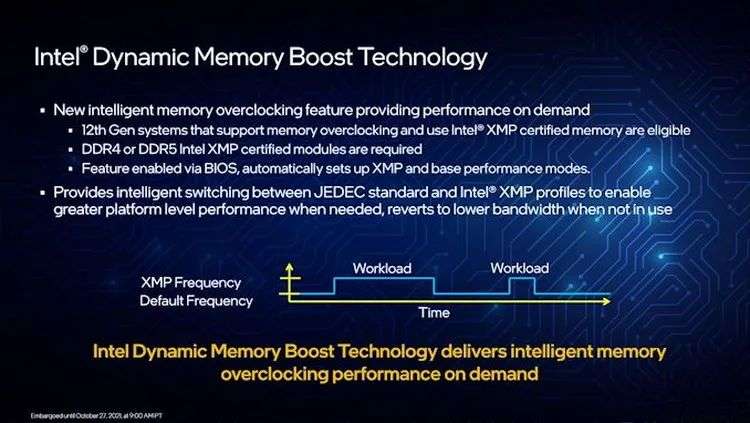 不仅如此,通过活用XMP 3.0规范,Intel还在12代酷睿上带来了“动态内存提速”功能。简单来说,就是CPU可以根据负载情况,实时地自动切换不同的内存频率文件。例如刚开机的时候,内存可能运行在DDR5-4800的频率下,而在打开一个游戏后,CPU就会自动套用XMP文件,将内存频率超到DDR5-6400甚至更高,并且在游戏结束后内存频率又能立刻降回来,以达到省电和降低发热的作用。