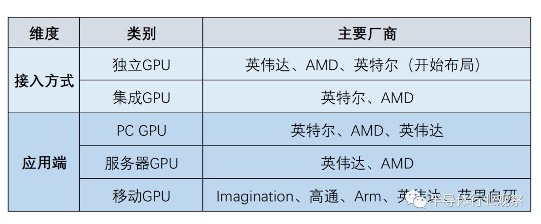另一种是根据应用端的不同可以分为PC GPU、移动GPU和服务器GPU。PC GPU是用于PC端,既有独立也有集成;移动GPU用于移动端,一般都是集成;服务器GPU是专为计算加速或深度学习应用的独立GPU。