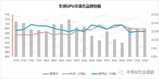 独立显卡领域主要由英伟达和AMD控制,而集成显卡领域由英特尔和AMD掌控。就整个GPU市场而言,英特尔在核心GPU上获得桂冠,市场份额为68%,英伟达和AMD为15%上下。