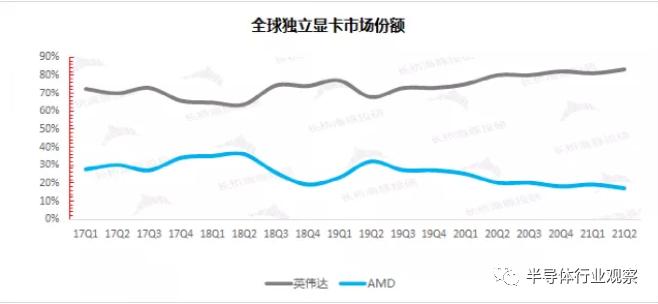 在进入21世纪后,英伟达从此前的蛮荒时代中脱颖而出,市场中主要还剩下英伟达和ATI。ATI在1985年至2006年之间是全球重要的显示芯片公司,2000年ATI推出Radeon品牌,从此与英伟达开创了独立GPU领域两强争霸的格局。2006年AMD斥资54亿美元收购ATI,旨在融合CPU和GPU。在AMD收购ATI之后的重心更多地转向中低端市场,性能端渐渐落后于英伟达。而后英伟达牢牢掌控着高端市场,AMD的GPU则成为了性价比的代名词。