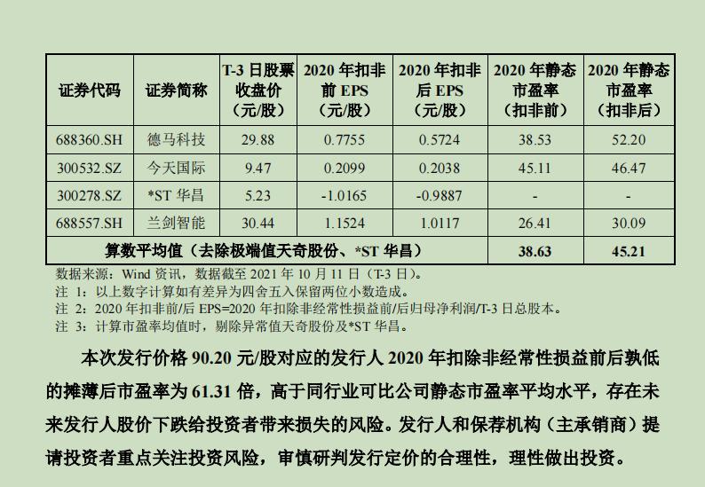在这份公告中明确指出,中科微至本次发行价格90.20元/股,对应的2020年扣除非经常性损益前后孰低的摊薄后市盈率为61.31倍,高于中证指数有限公司发布的行业最近一个月平均静态市盈率,存在未来股价下跌给投资者带来损失的风险。此外,公司61.31倍的静态市盈率,也高于同行业可比公司静态市盈率平均水平(45.21倍),因此存在未来股价下跌给投资者造成损失的风险。