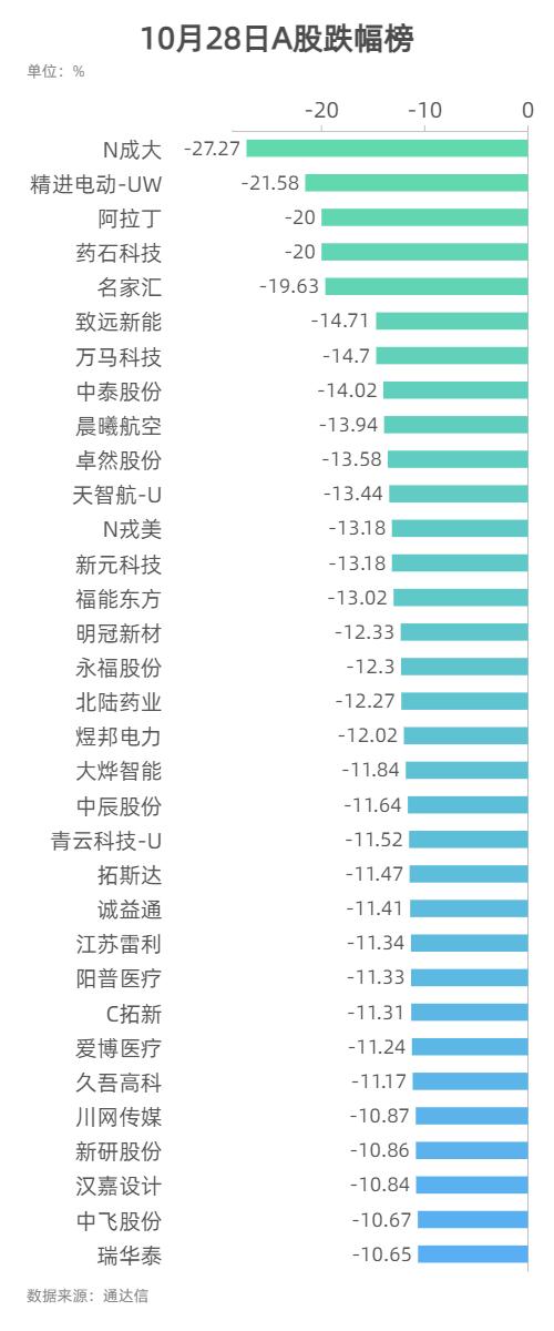 尤其是10月28日上市的新股成大生物首日表现更是令人大跌眼镜,截至收盘,该公司竟然以27.27%的全天跌幅位列A股跌幅榜第一。原本不少投资者以为这只医药行业的科创板新股会成为一只“大肉签”,而现实是,如果中签的投资者在上市首日没有卖出,那么将会大幅亏损1.5万元。