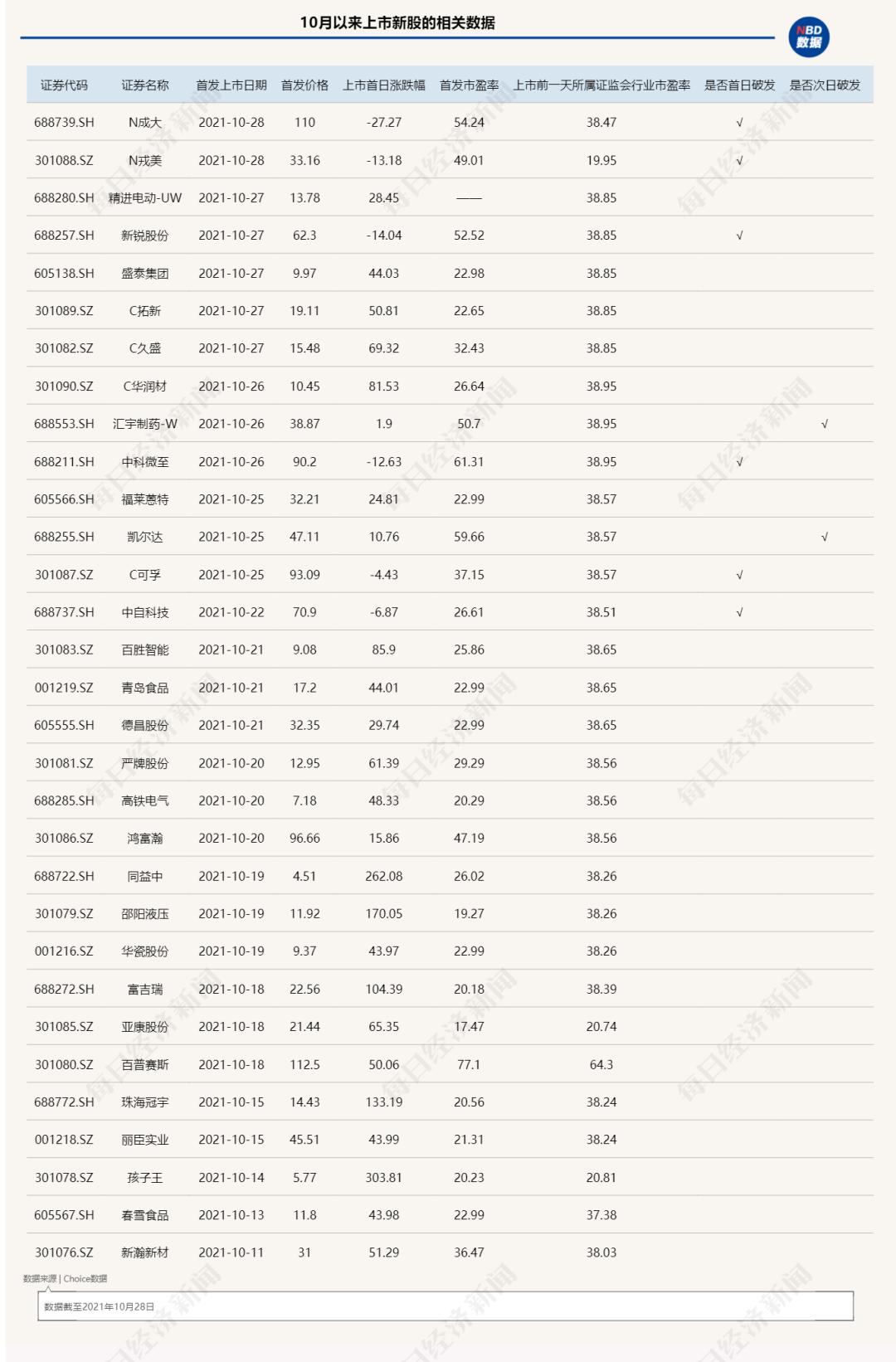 此外,10月28日上市新股的成大生物,其110元/股的发行价格低于“四数孰低值”,且对应的2020年扣除非经常性损益前后孰低的摊薄后市盈率为54.24 倍,低于行业可比公司扣非后静态市盈率平均水平,但在上市首日仍然没有逃脱大幅破发的命运。