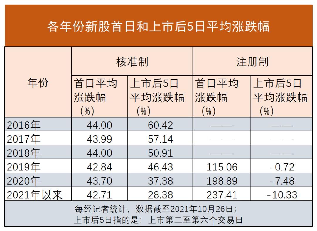 事实上,打新收益率在持续下滑而且风险也在增加。《每日经济新闻》记者统计到,核准制发行下,2016年~2021年10月26日的各年份新股首日平均涨幅为44.00%、43.99%、44.00%、42.84%、43.30%和42.71%。如果说,首日平均涨跌幅不够明显,那么从上市后5日(上市第二至第六个交易日,下同)收盘涨跌幅看或许更为显著,2016年~2021年以来各年份新股上市后5日平均涨幅分别为60.42%、57.14%、50.91%、46.43%、37.38%和28.38%。