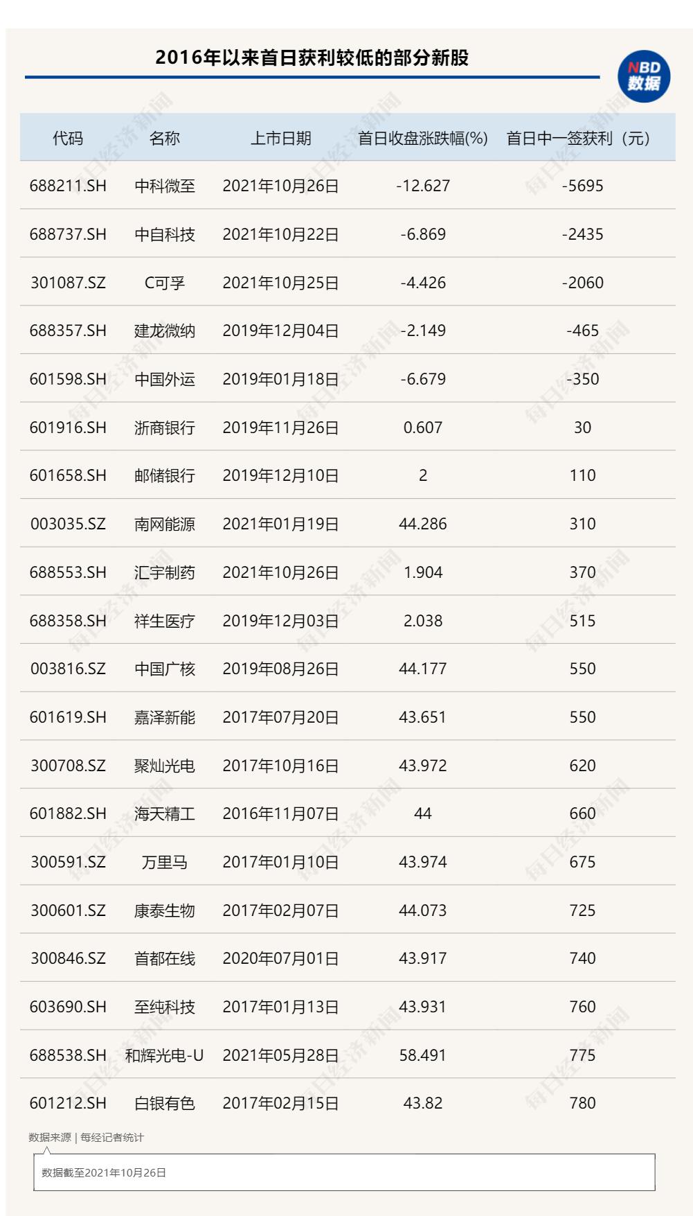 随后,10月25日、10月26日在创业板上市的可孚医疗和在科创板上市的中科微至相继上市即破发,首日收盘跌幅分别为4.43%和6.87%。与此同时,新股不败的神话也开始显得难以为继。《每日经济新闻》记者统计到,中科微至、中自科技、可孚医疗和建龙微纳上市首日投资者的收益分别为-5695元、-2435元、-2060元和-465元。