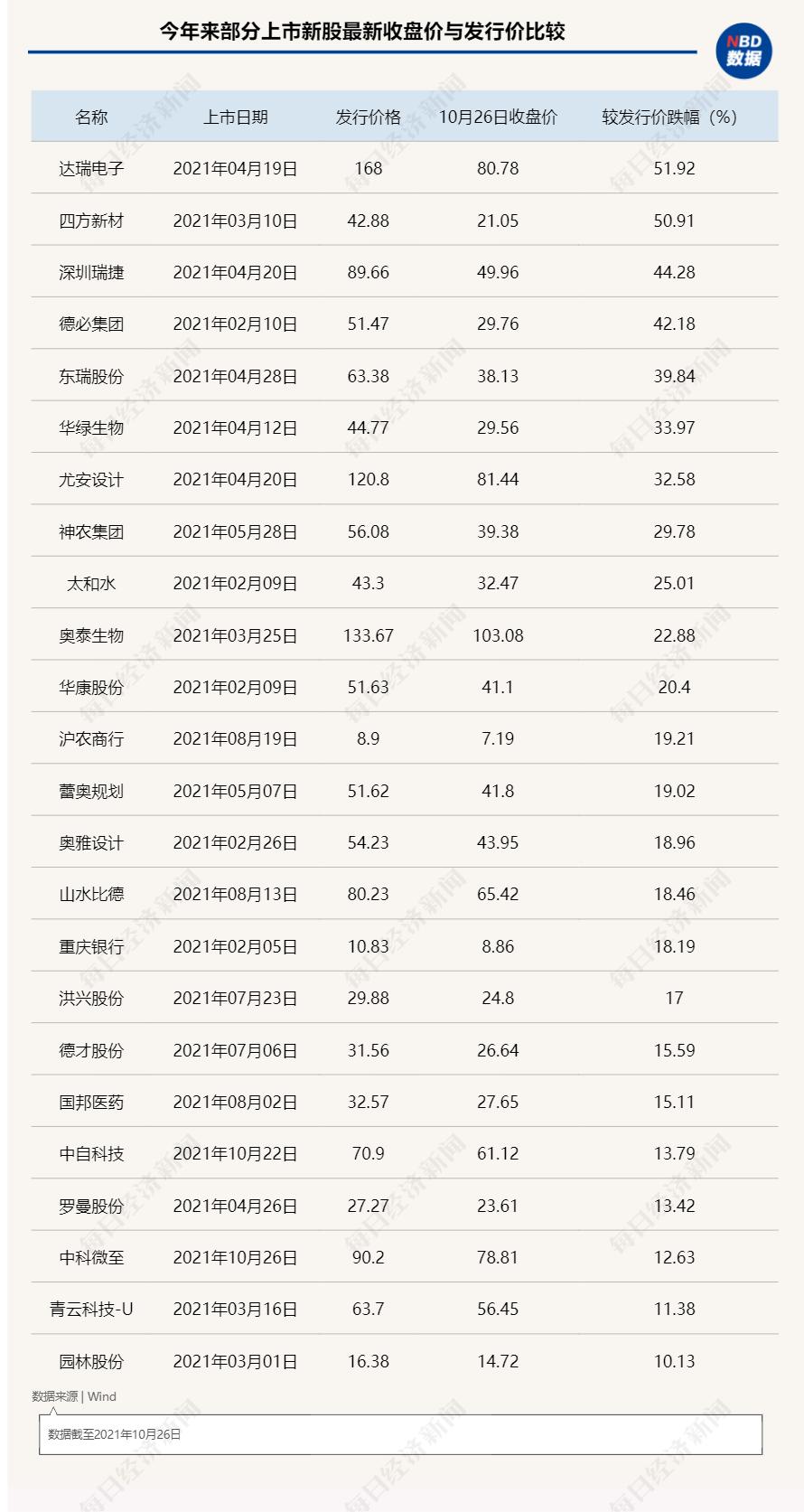 若仅以2021年截至10月26日上市的397只新股来看,其中已有51只新股上市后的最低价跌破了发行价,即有51只新股年内曾发生过破发,破发比例达12.85%。即使截至10月26日,仍有42只新股的收盘价低于发行价(破发比例达10.57%),其中11只新股破发程度超过20%,尤其是达瑞电子、四方新材、深圳瑞捷和德必集团10月26日收盘价较发行价还低了51.92%、50.91%、44.28%和42.18%。