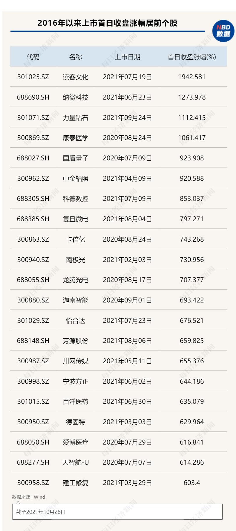 同时,注册制发行下,也出现了大批首日涨幅超3倍、5倍、10倍,甚至近20倍的新股。Wind数据统计显示,注册制下发行的新股中有近20%的新股上市首日涨幅超过300%,其中读客文化、纳微科技、力量钻石和康泰医学上市首日收盘涨幅分别达到1942.58%、1273.98%、1112.42%和1061.42%。