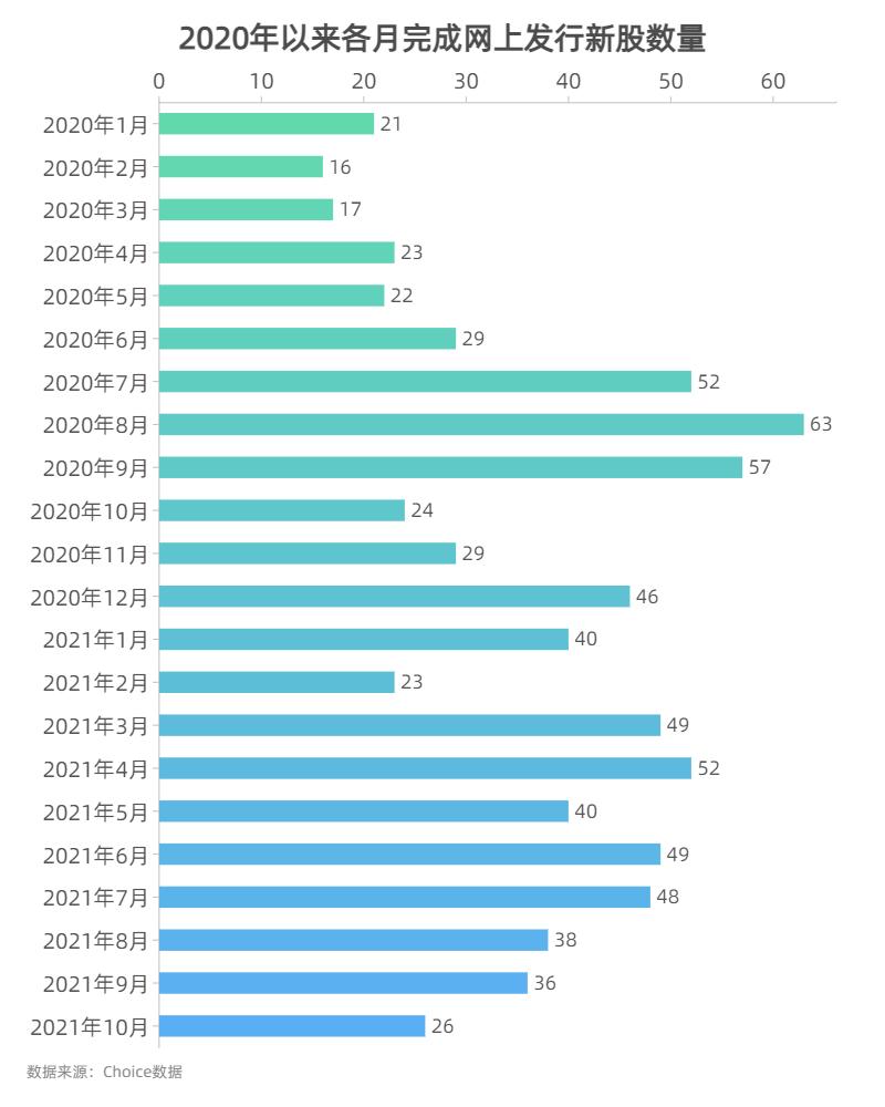 从2020年以来各月完成网上发行新股数量来看,2021年10月完成网上发行的新股数量为26只,为今年来新股网上发行量第二少的月份。自今年7月份以来,各月完成网上发行的新股数量也呈现逐月递减的态势。