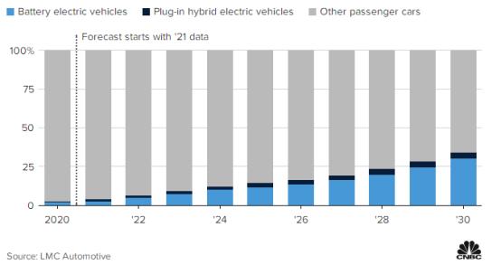LMC预计,到2030年,电动汽车将占美国新车销量的34.2%,全电动占30.1%,插电式混合动力车占4.1%。