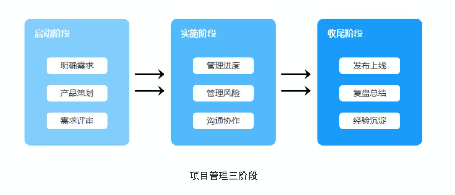 在项目启动阶段的重点是做计划,计划为纲,包括产品策划、提前识别风险、完成需求评审会,得出项目排期表;在实施阶段的重点是监控进度,监控进度有几个工具:项目排期表、任务进度表、每日站会等等,而且项目计划需要在实施阶段根据实际情况动态调整。