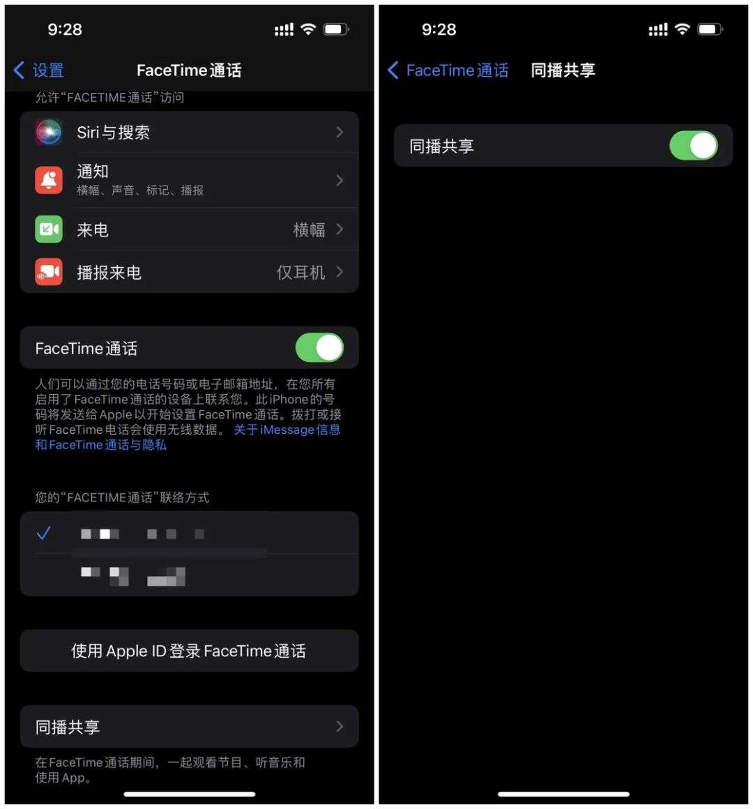 第二步,在「设置 - FaceTime 通话」中确认自己已经打开了 FaceTime 通话和同播共享的开关。