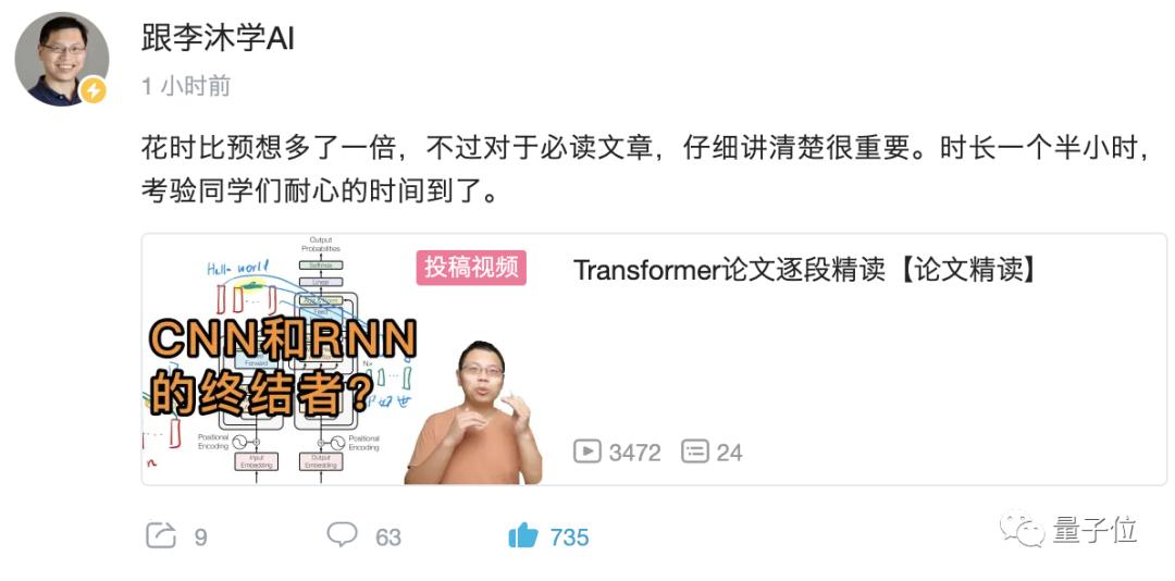 Transformer高票当选,李沐火速更新,逐段精读长达一个半小时。