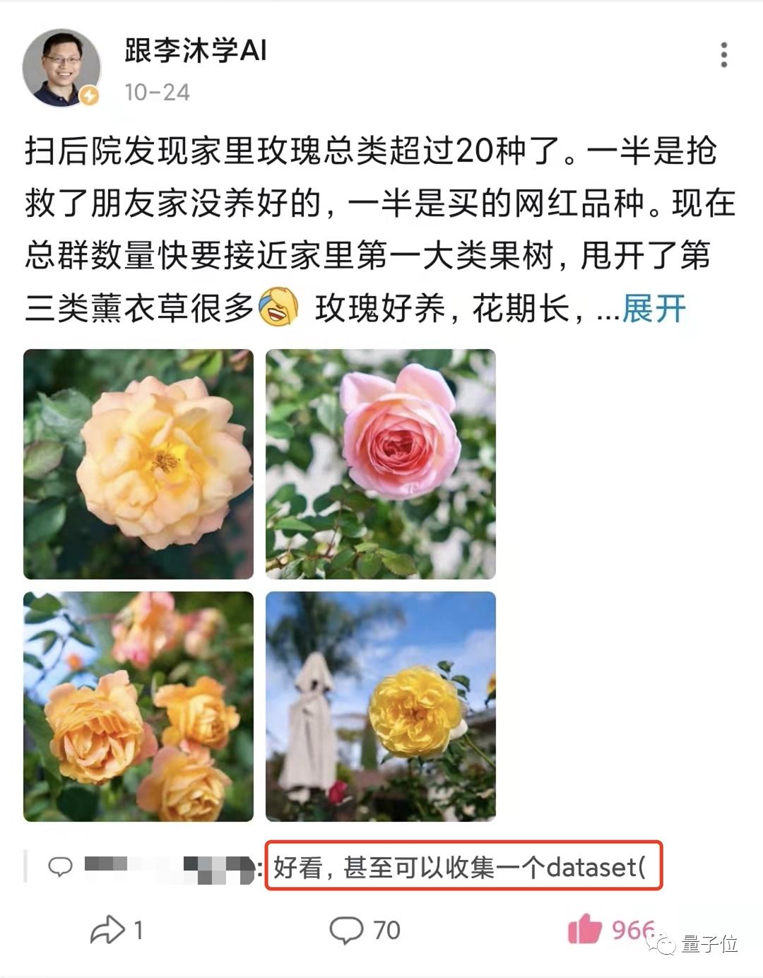 李沐晒了家里后院种的玫瑰,被粉丝建议收集成数据集,再就地办个玫瑰图像分类比赛,模型可以叫RoseNet。