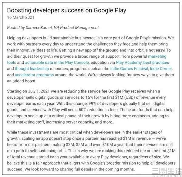 需要注意的是,此前就在今年3月,谷歌通过安卓开发者博客宣布了“小型企业计划”。自2021年7月1日起,对于开发者每年在 Google Play中赚取的首个100万美元收入,谷歌所抽取的佣金将从原来的30%下调至15%。并且谷歌方面宣称,在这一政策改变后,预计全球99%使用Google Play的开发者将会降低50%的成本。