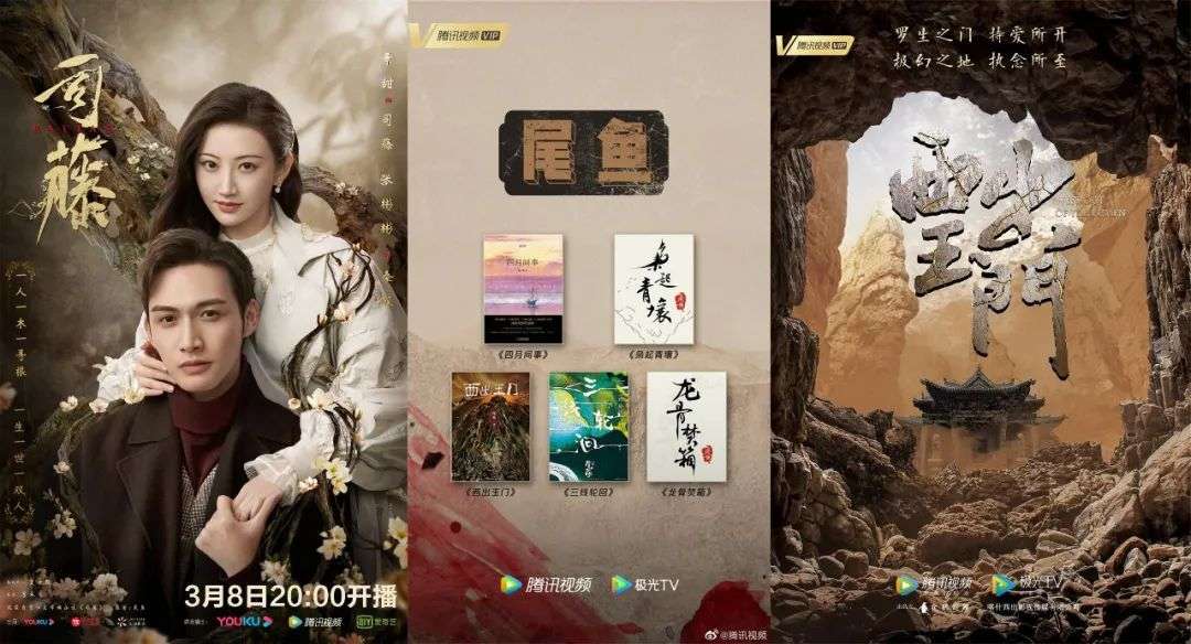 以晋江女频头部作者尾鱼为例,腾讯视频官宣购入其五部已完结长篇小说,分别为《四月间事》《枭起青壤》《西出玉门》《三线轮回》与《龙骨焚箱》。其中,《西出玉门》已释出网剧概念海报,据传由倪妮、黄晓明领衔主演。