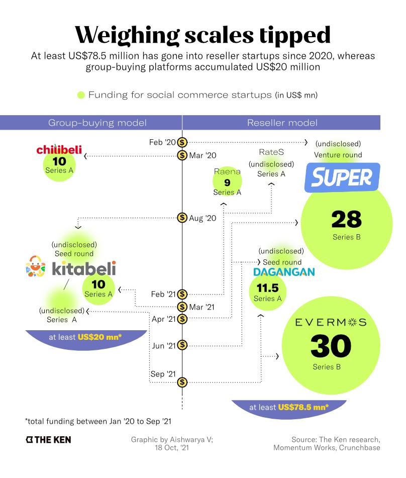 在大多数情况下,Meesho一直在为经销商服务,而 Kitabeli 只与终端消费者打交道。如果你看看印尼的社交电商领域,会发现,更多资金流向采用转售模式的企业。去年以来,资金规模达7800万美元。