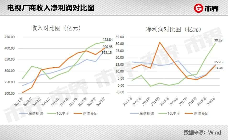 “较劲”的市值背后,三家电视厂商的收入和净利润其实也是高低交错。