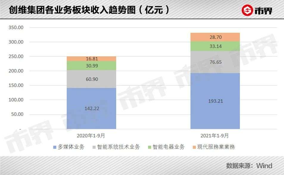其中包括电视销售、互联网增值服务和光伏业务在内的多媒体业务,2021年1-9月给创维带来了193.21亿元收入,同比增长35.85%,仍是集团内最为重要的一部分业务。