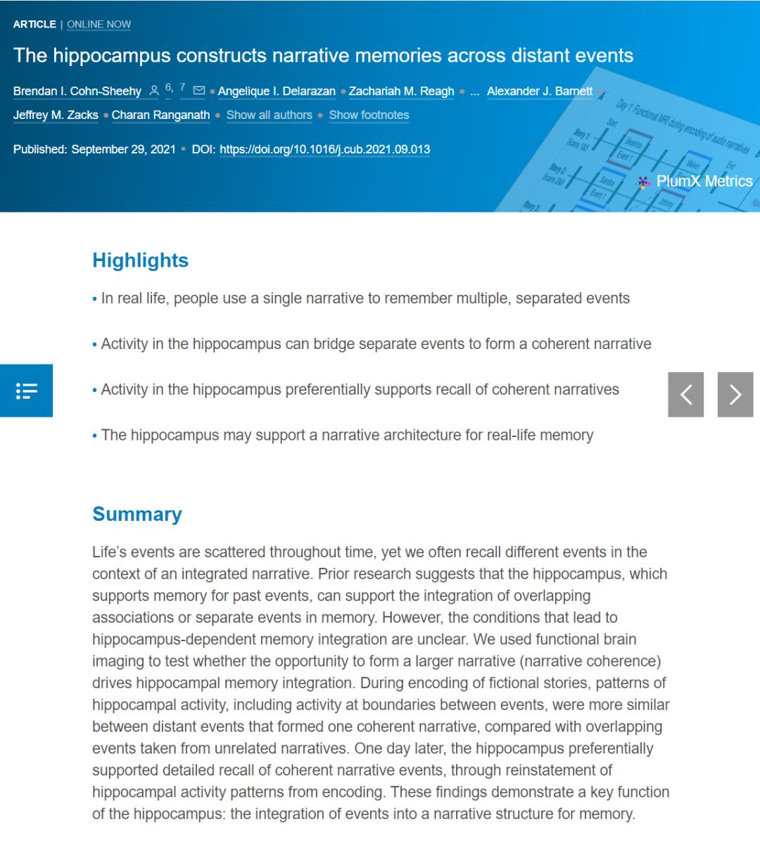 看电影时,你是否有过这样的经历:前面发生的某些剧情看得云里雾里,直到故事结尾导演将伏笔一一收回,才恍然大悟。我们之所以能跟着导演回收线索,是因为我们有将发生在不同时间的事件(temporally distant events)联系起来,放置进统一的叙事(coherent narrative)之中的能力。在这篇发表于Current Biology的文章中,来自加州大学戴维斯分校(UC Davis)的研究团队探究了这一能力背后的神经机制,并发现海马体(hippocampus)在其中扮演了重要作用。不夸张地说,海马体是我们大脑中的”故事大师“。