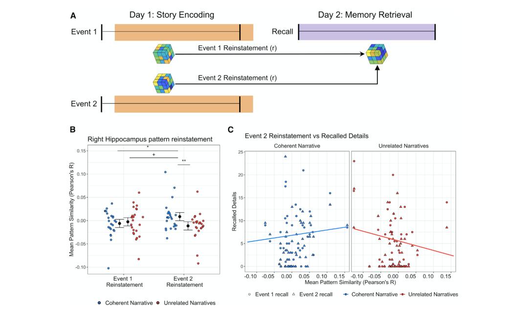 如果海马体参与了大脑对叙事的构建,那么海马体在被试听取可以被放进统一叙事之中的两个事件时,将会体现出比被试在听取两段没有关联的事件时更为相似的神经活动特征(neural activity patterns)。相反,如果海马体仅仅负责处理和整合相似的记忆片段,那么不论两个事件是否构成统一的叙事,只要它们涉及同一人物,海马体对于它们便会呈现同样相似的神经活动。