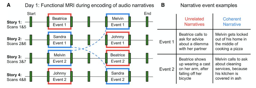 为了检验这一猜想,研究者们向被试播放了四段录音,每段录音由几个相互独立的场景构成(图1a),它们分别描述了有关两个主要角色的事件(例如Story 1中的Beatrice与Melvin),而这两个角色也在另一段录音(Story 3)中再次出现。值得注意的是,对于其中一位人物(Beatrice),ta在两段录音中的两个相关事件(Event 1与Event 2)可以被放进同一个故事之中(图1b:Coherent Narrative),而对于另一位人物(Melvin),两段录音中的事件之间并无叙事层面的关联,仅仅涉及了同一个人(图1b:Unrelated Narratives)。在被试听取每段故事时,研究者们通过功能性核磁共振(fMRI)记录了他们的大脑活动。