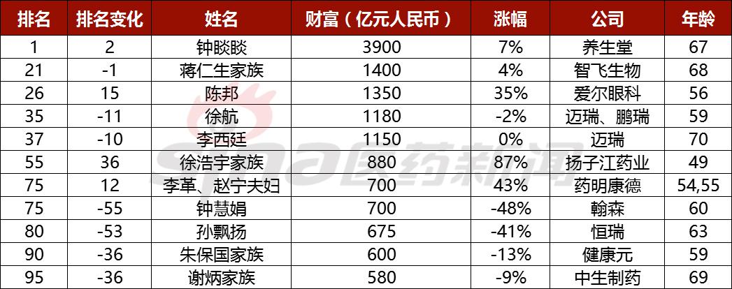 另外,扬子江药业徐浩宇家族和CRO龙头药明康德李革、赵宁夫妇排名都较去年有大幅提升,财富几乎翻倍。