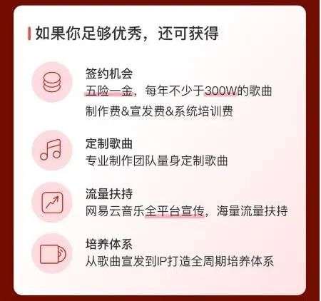 10月14日,网易云音乐成立“音乐人训练班”并开启首期学员招募。据公开信息,该音乐人培训班完全免费,以培养优质的专业歌手为目标,提升平台的“推新”、“造星”能力。这个计划有点像之前TVB艺员训练班的意思,优秀学员还可以获得签约机会、定制歌曲、流量扶持、培养体系等资源,做一个有五险一金的音乐人。