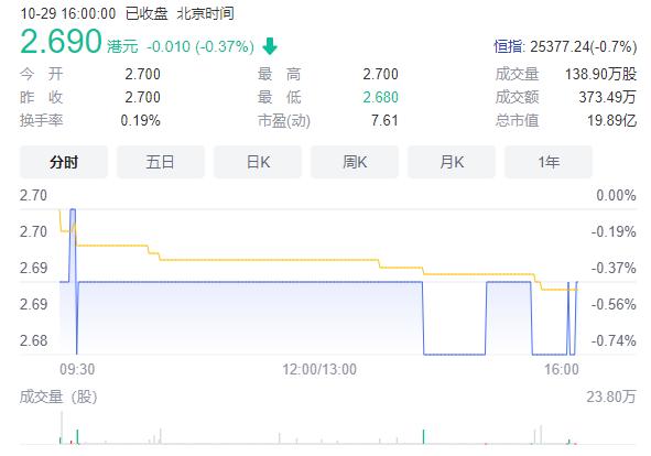 受此消息影响,10月29日金嗓子成交极其低迷,股价报收2.69港元,市值不到20亿港元。