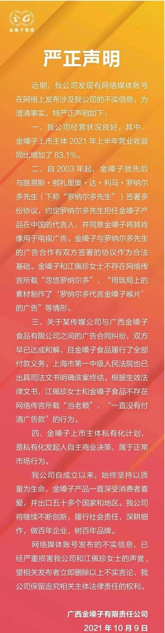 10月9日,广西金嗓子集团公众号发布声明称,公司不存在“忽悠罗纳尔多”代言广告的情形,并且已经与某广告公司达成和解,并全部付款,不存在网络传言所载“当老赖”“一直没有付清广告款”的行为。望相关发布者删除不实言论,并保留追责权利。